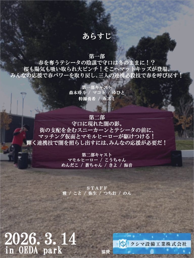 EVENT | NEWS2026年3月14日 大枝公園で二部構成でのヒーローショー 2026年2月26日 by MAMORU マモルヒーローズ、守口に春をぶちかますで キッズチームの成長、大人チームの迫力満載なパフォーマンスの二本立て みんなの笑顔と絆で、守口の春を全力で守り抜くで 熱い応援よろしくー日時 2026年3月14日 物販 13:00~ 開演 14:00~場所 守口市大枝公園